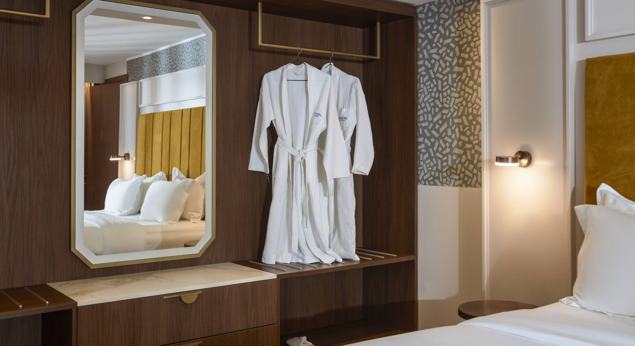 The bathroom includes a walk-in shower, a bathtub, and premium amenities such as bathrobes and slippers. With modern comforts like a minibar, coffee and tea facilities, a business desk, and high-speed Wi-Fi, the Suite with 2 Balconies provides a refined and tranquil escape for VIP stays, longer visits, or special moments that call for something more.
