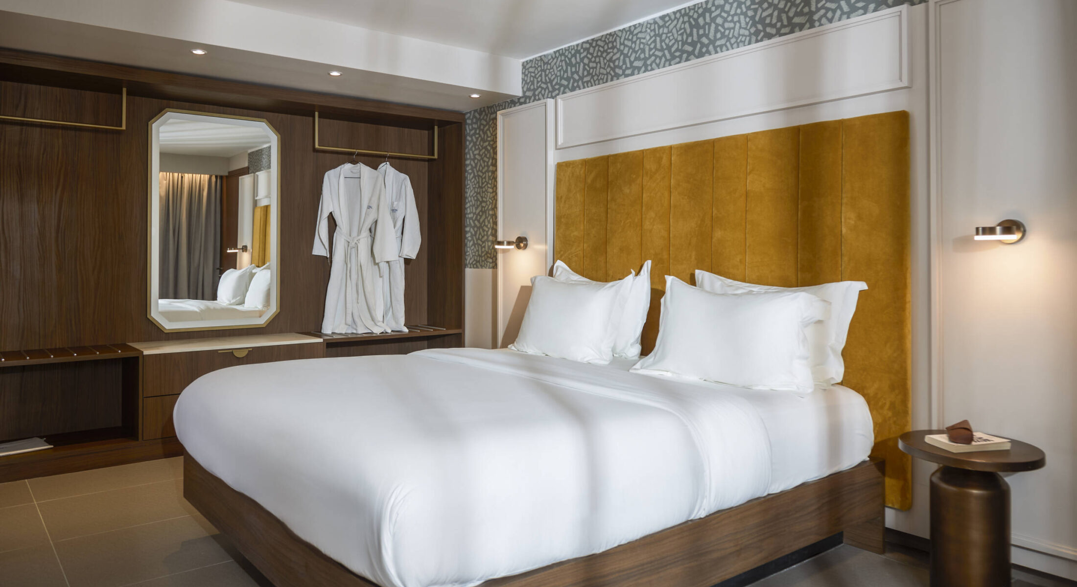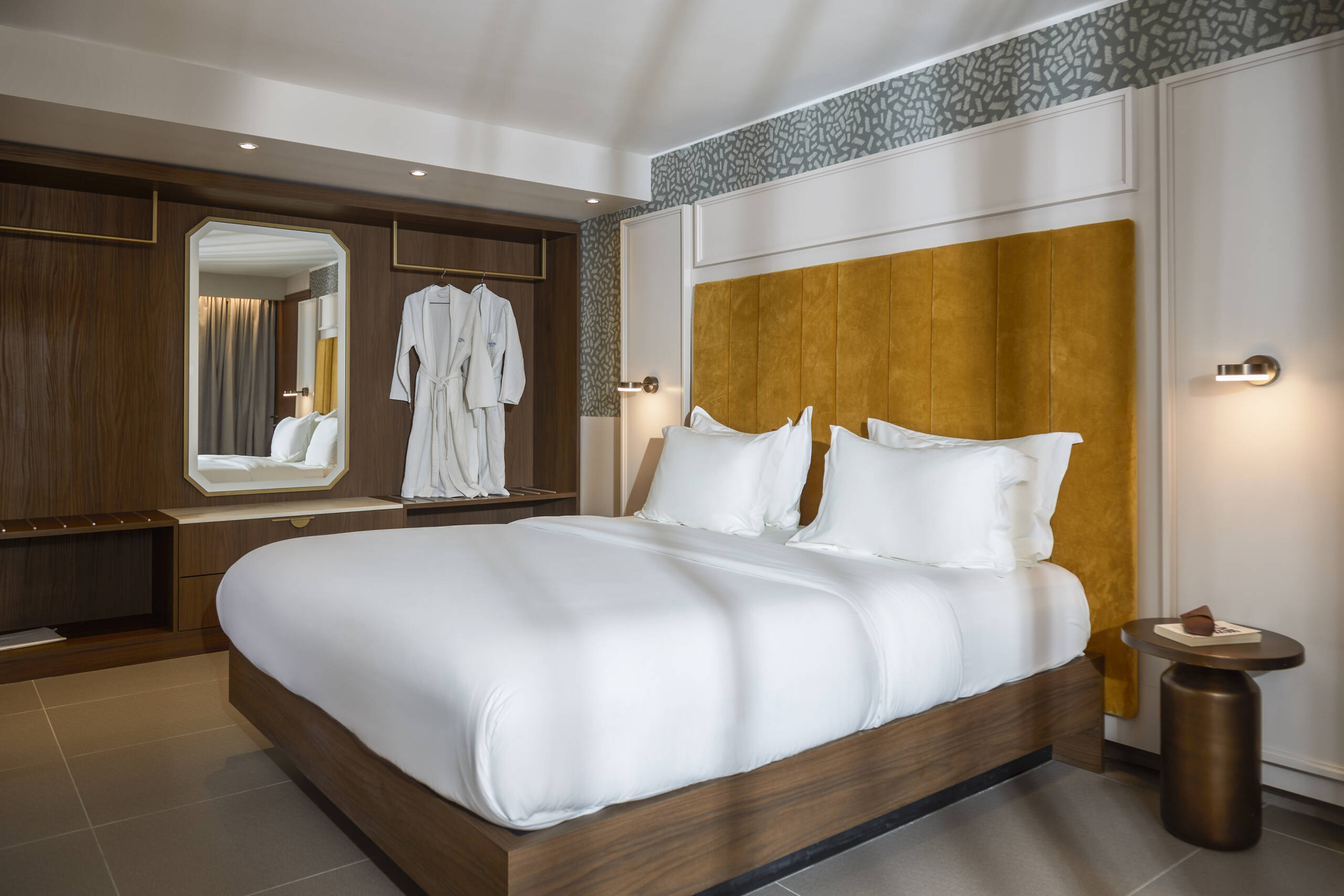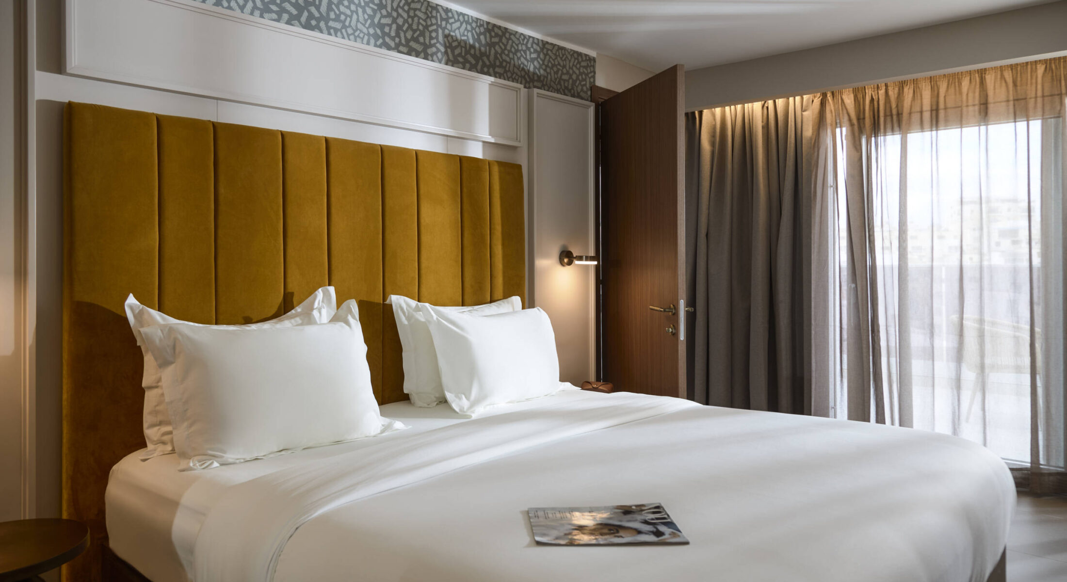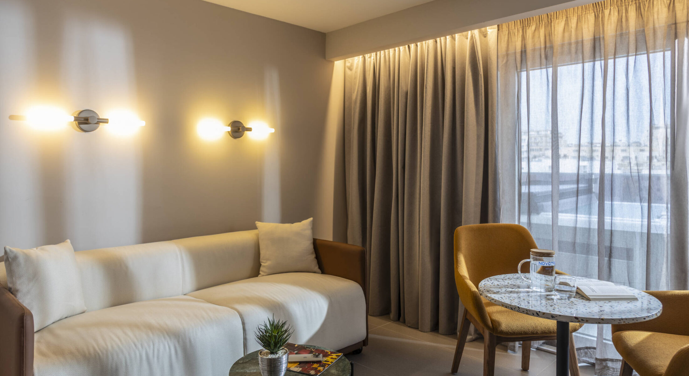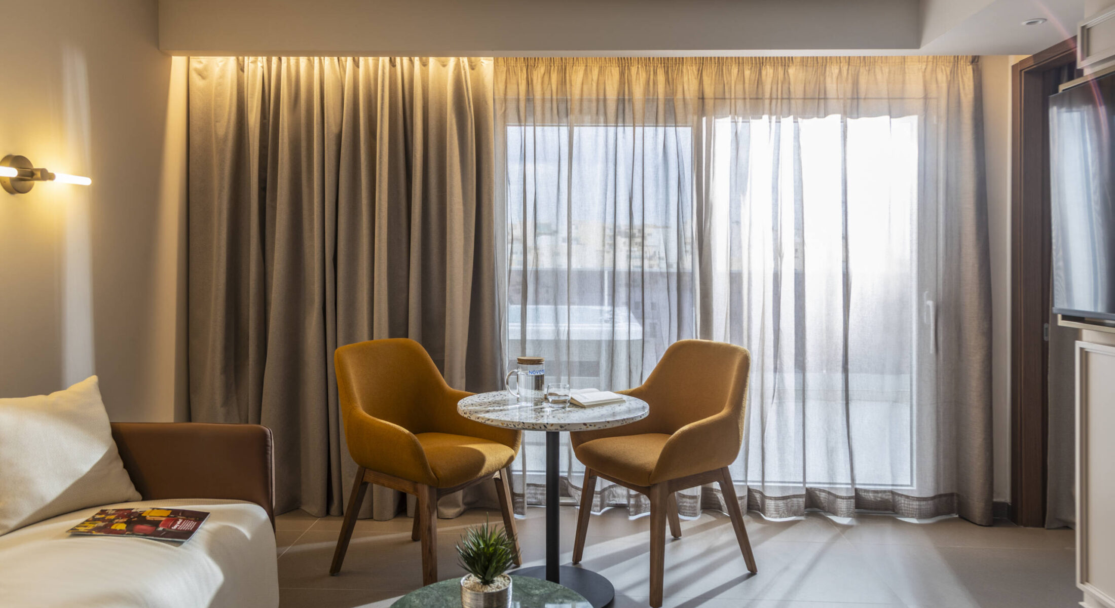 The Suite with 2 Balconies offers an elevated level of space and comfort, designed for guests who value privacy, style, and sweeping views. Spanning 49 m², this suite features a spacious lounge, a private dining area, and a beautifully appointed king-size bedroom. Two separate balconies reveal panoramic views of the city skyline, allowing natural light to flow through every corner of the suite.
